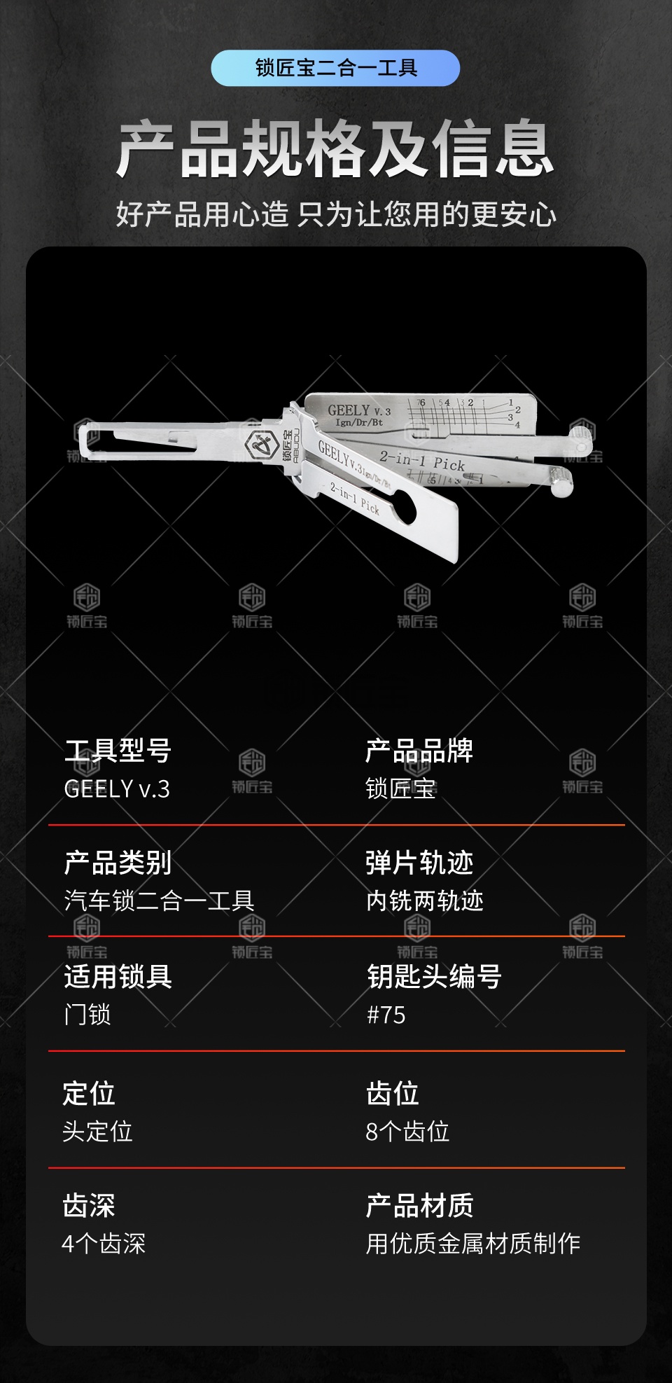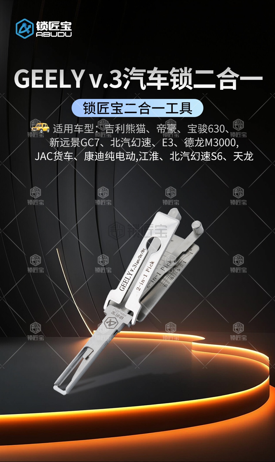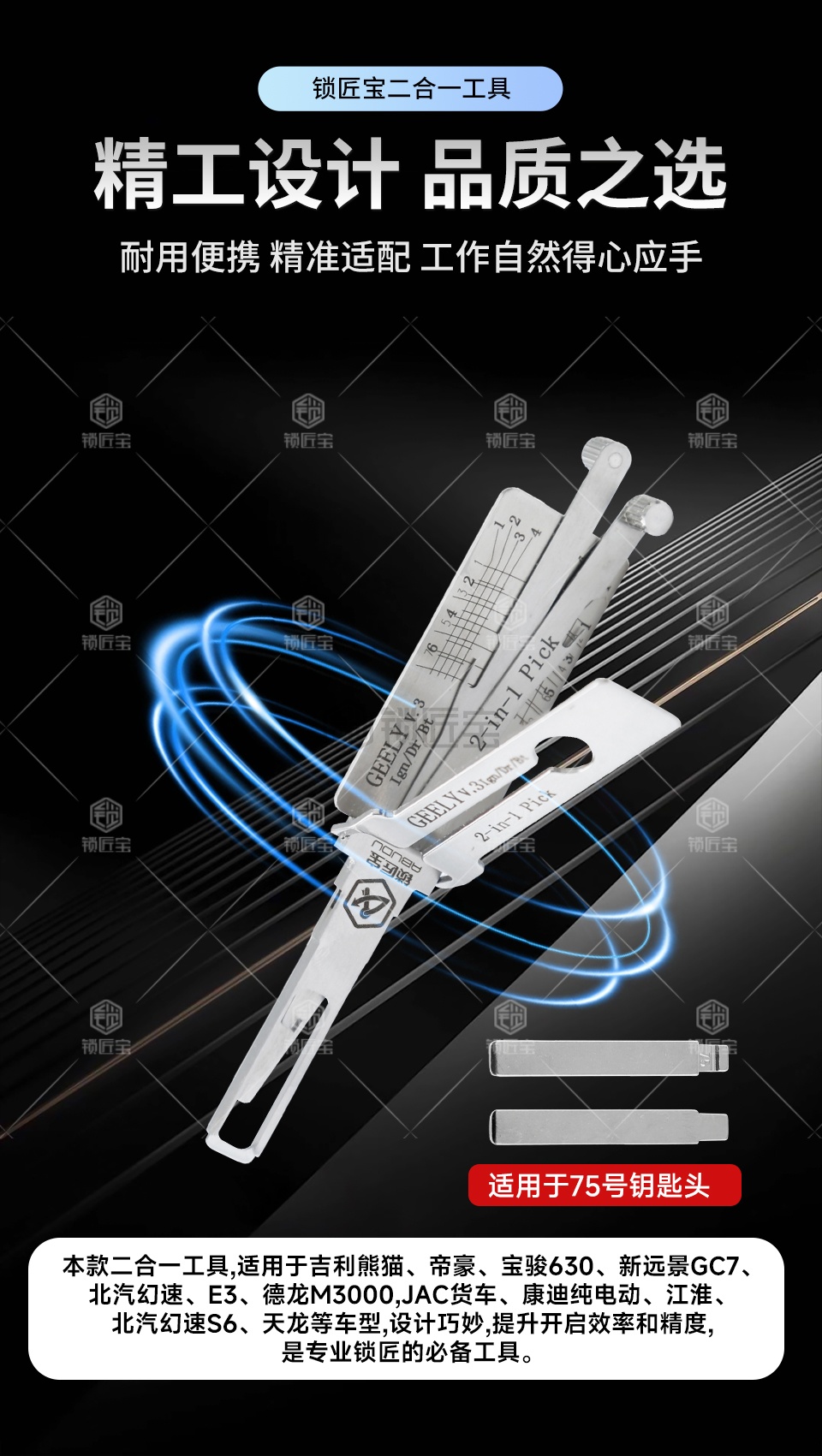GEELY吉利一代汽车锁锁匠宝二合一工具采用内铣两轨迹设计,集读齿与开启于一体,适用于吉利熊猫、帝豪、新远景GC7(需后抽约0.2mm)、宝骏630(7齿可用)、北汽幻速/幻速S6、E3、德龙M3000、JAC货车、江淮(75号)、天龙及康迪纯电动等多种车型,兼容性强,操作顺畅,适合锁匠多车型日常使用。