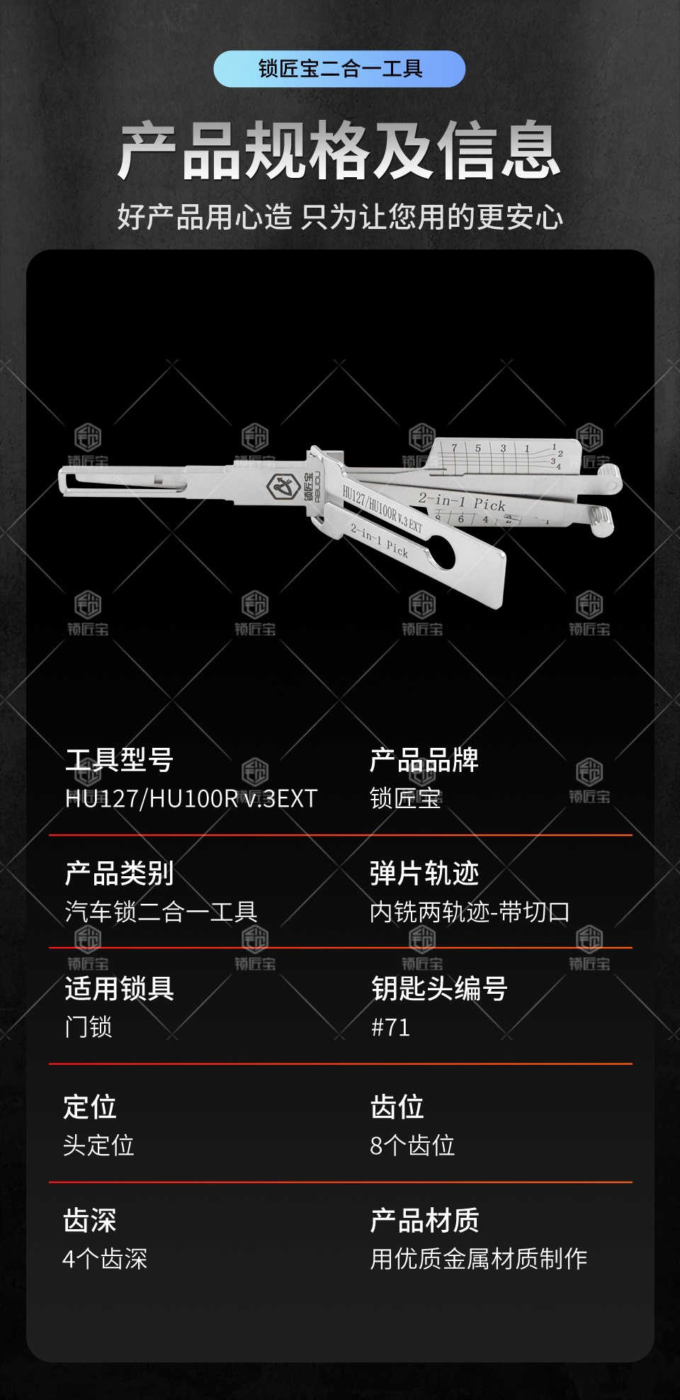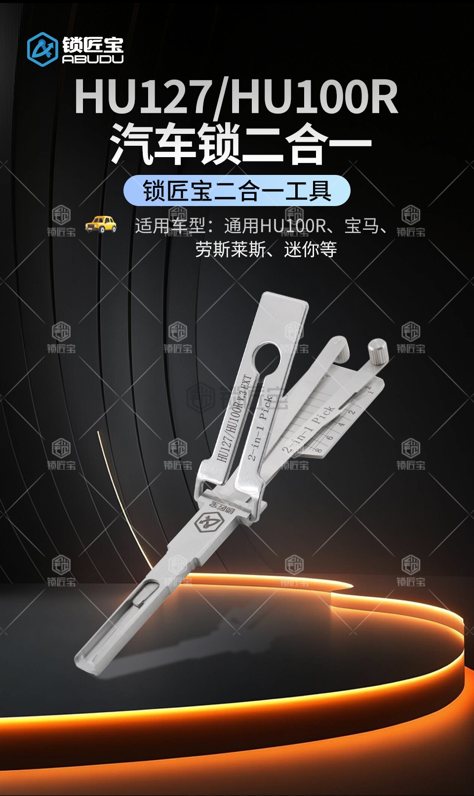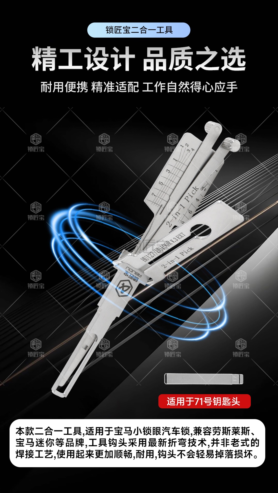 工具钩头采用最新折弯技术,并非老式的焊接工艺,使用起来更加顺畅,耐用,钩头不会轻易掉落损坏。该工具通用HU100R,型号重新定义为HU127,可在秃鹰数控机上选择对应型号铣钥匙。适用于宝马小锁眼汽车锁,兼容劳斯莱斯、宝马迷你等品牌。
