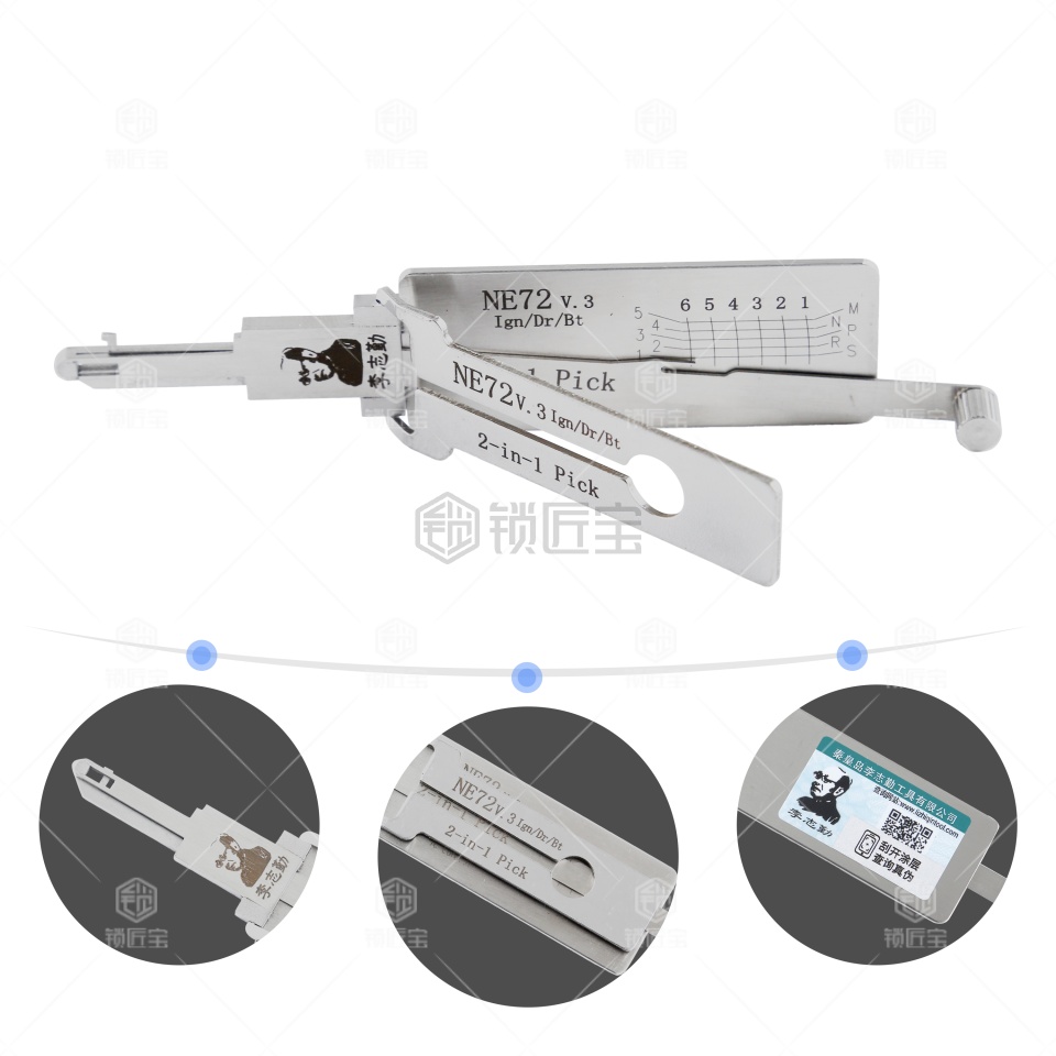 李氏NE72读开二合一,适用于标致206的车锁开启与暗配,这款工具有很多种叫法,有李氏读开二合一、开启阅读、连读代开二合一工具,从字面上理解,它就是定位开和读齿器功能合并后的最新式锁匠用品。NE72读齿开启二合一可精确定位技术性开启标志206的汽车锁,不须拆解锁芯,不需开启,并可阅读出全部齿号,读出齿号后即可使用李氏剪齿钳剪配出钥匙(读出数据直接做出钥匙),可按模版给客户配出原装钥匙,不伤锁片,方便快捷,操作简单,全不锈钢精制,经久耐用,是高级锁匠的必备用品
