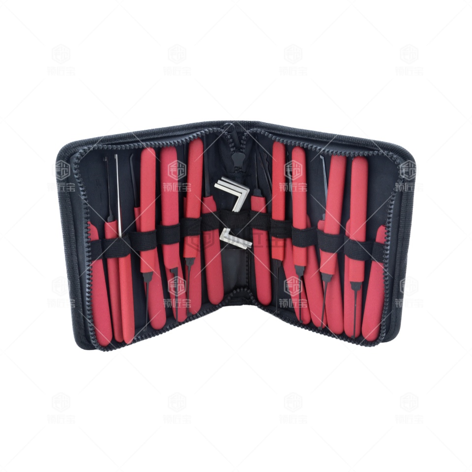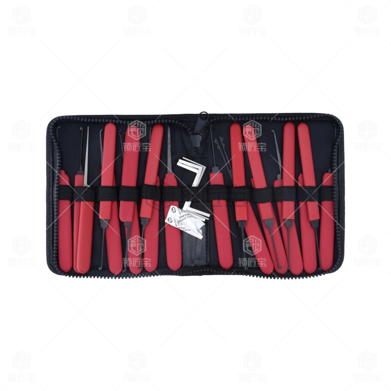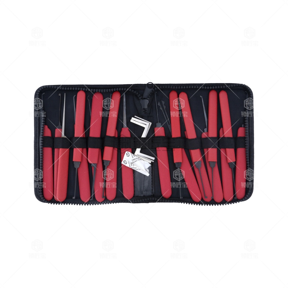 精品20支单钩单钩王,这次出品的红色装单钩包,选材全进口德国高强度工具钢条研磨制作,表层碳黑防锈处理。手把选用原生料树胶套裹。皮包包装,使得整体工具达到前所未有的高度,红色防滑抹杀手柄,手感极好,颜色鲜艳时尚,精品16支单钩单钩王该产品被称为命名为“中国锁匠 单钩王”。