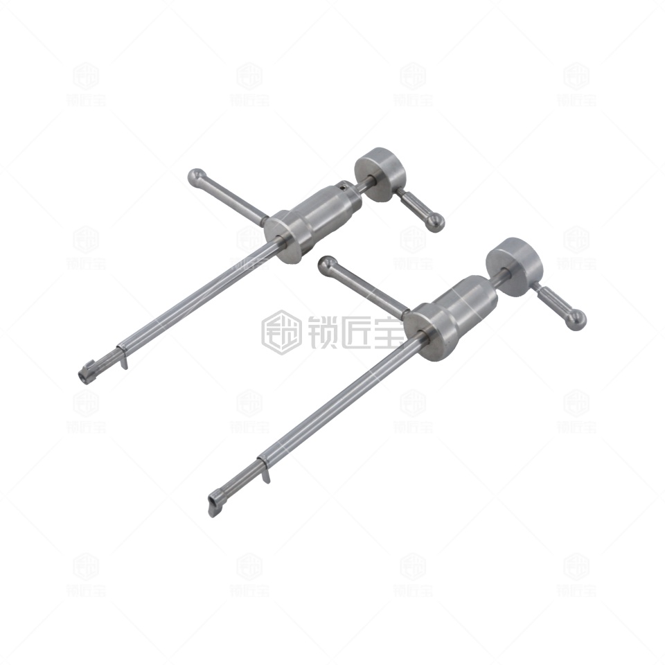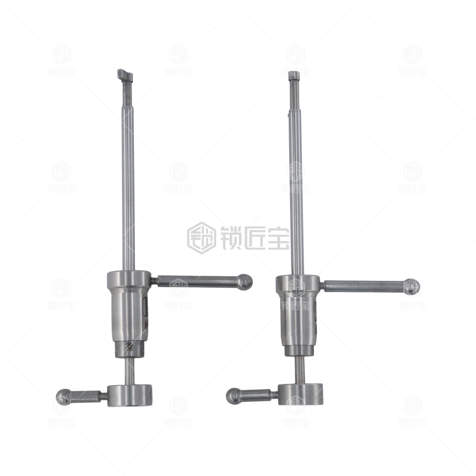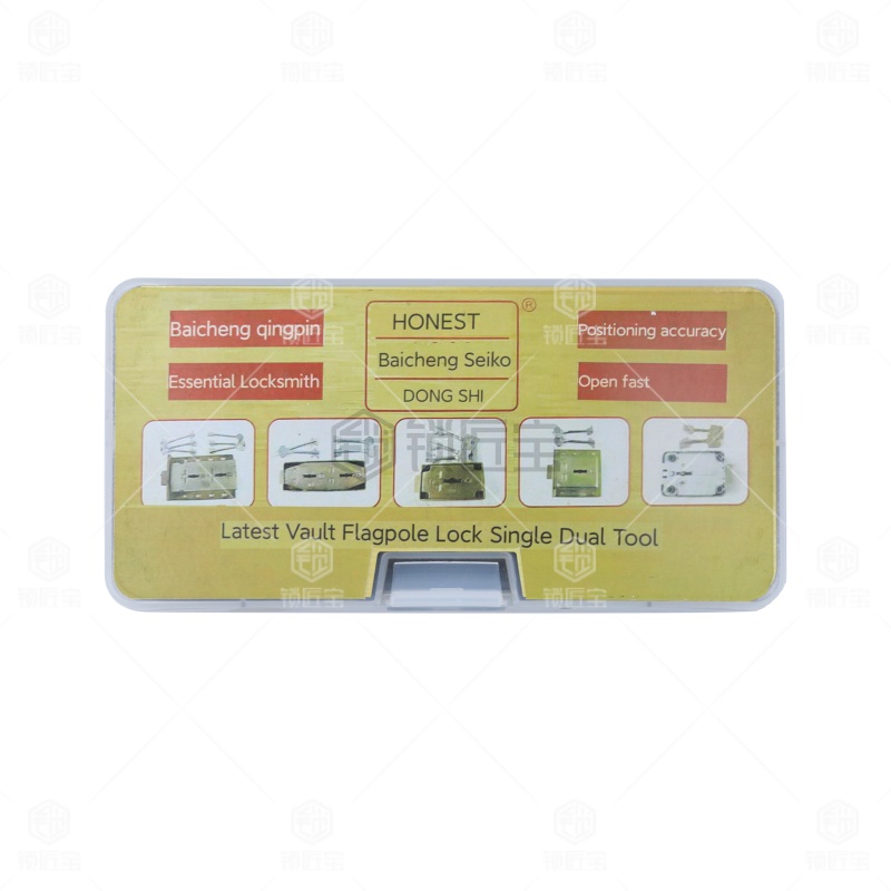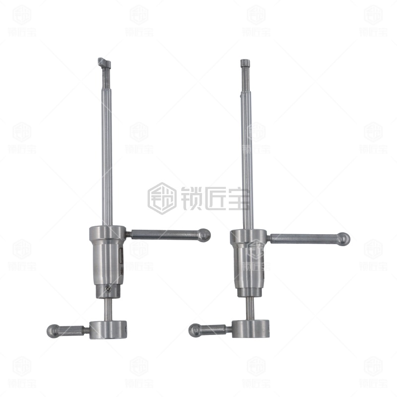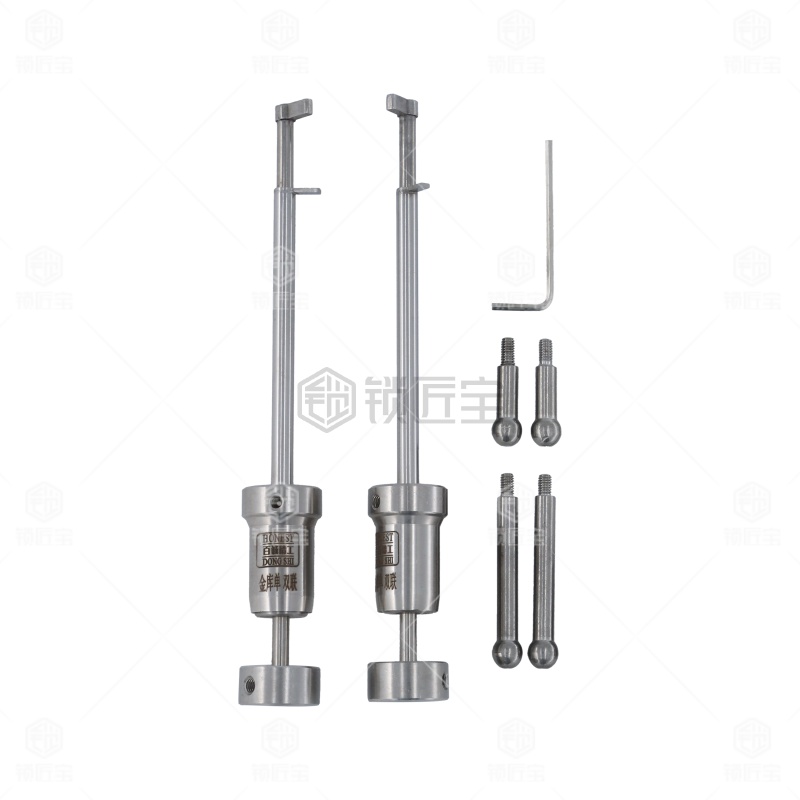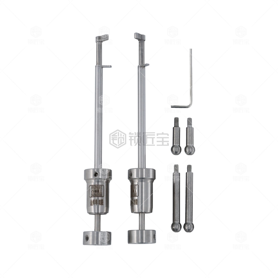本产品是百诚推出的金库锁双联叶片锁旗杆锁工具。此种型号专用于,使用方法是将两根带动杆安装在工具上,别子装长带动杆,拨子装短带动杆。然后插入锁芯别子带动锁芯转动的同时用拨子拨动叶片,此时注意别子不同于一般民用锁的别子,在使用时力量可以稍微大一些,让拨子的感觉更明显。