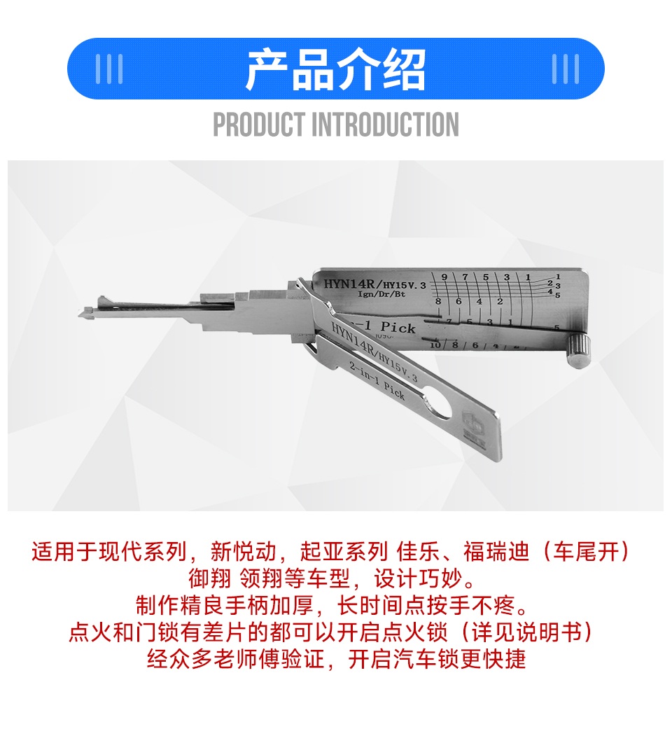 本款二合一工具,适用于现代系列,新悦动,起亚系列 佳乐、福瑞迪(车尾开)御翔 领翔等车型,设计巧妙。制作精良手柄加厚,长时间点按手不疼。点火和门锁有差片的都可以开启点火锁(详见说明书)经众多老师傅验证,开启汽车锁更快捷。适用钥匙头50号